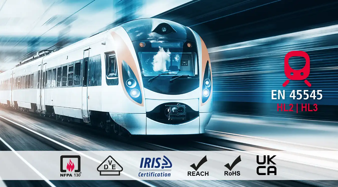 UL 94’e göre V2 sınıfındadır ve EN 45545-2 (HL3) standardına uygundur.