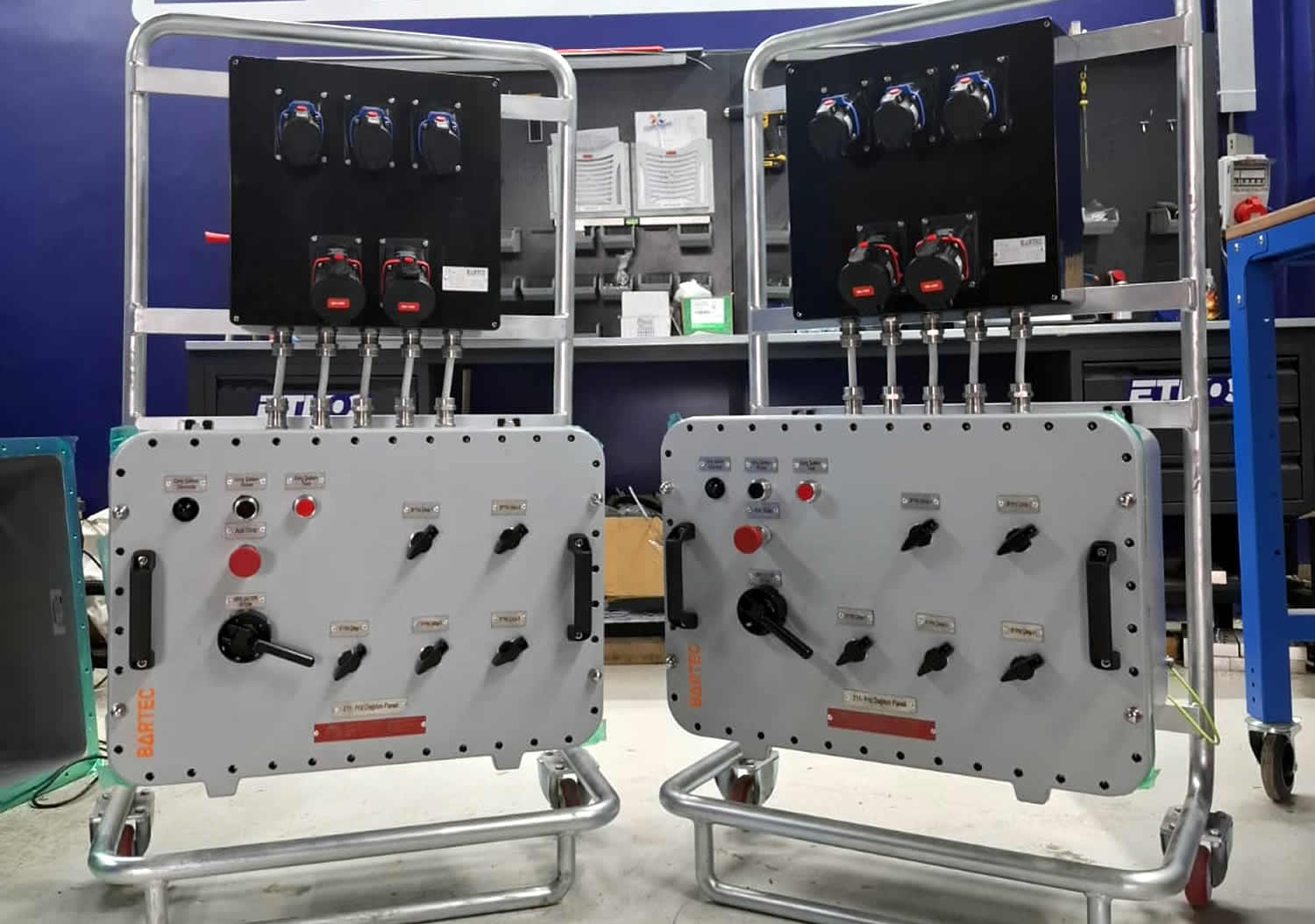 Bu proje kapsamında, IIC gaz grubu bulunan patlayıcı ortamlarda güvenli kullanım gereksinimleri dikkate alınarak; alüminyum Ex d pano gövdesi ve GRP malzemeye sahip fiş-priz beslemeleri kullanılmıştır. Mobil kullanım ihtiyacına uygun olarak panolar tekerlekli tasarlanmış ve sahada esnek, güvenli enerji dağıtımı hedeflenmiştir.