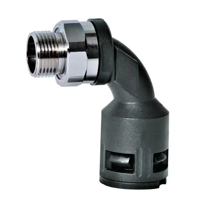 Hızlı tip, 90° açılı plastik konnektör; metrik, döndürülebilir, nikel kaplamalı pirinç dış dişli yapıya sahiptir. Entegre snap-in manşonlu olup sızdırmazlık elemanlarıyla birlikte sunulur. Yüksek yoğunluklu yapıdadır. O-ring (OR) ve düz conta (FRH) dahildir. EN 45545-2 HL3 standardına uygundur.